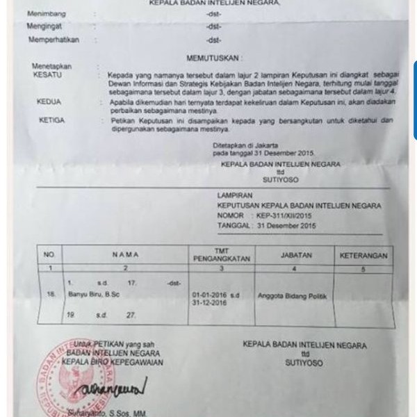Artis Banyu Biru Djarot membuat heboh media sosial. Putra politikus Eros Djarot itu mengunggah SK pengangkatannya sebagai anggota bidang politik Dewan Informasi Strategis & Kebijakan (DISK) Badan Intelijen Negara (BIN) di akun Path-nya.