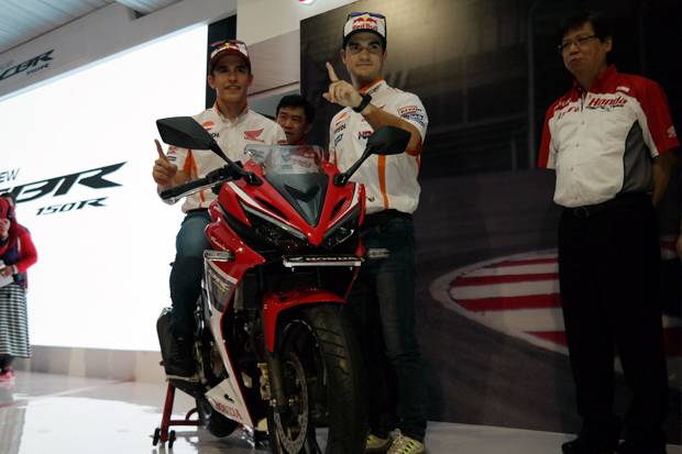 SENTUL – Hari ini PT Astra Honda Motor (AHM) merilis model sport terbaru All New Honda CBR150R dengan balutan inovasi baru. Seluruh sektor motor seperti mesin, sasis dan desain bodi yang semakin menarik perhatian. Peluncuran dilakukan bersama pembalab Moto GP Honda yaitu Marquez dan Pedrosa.