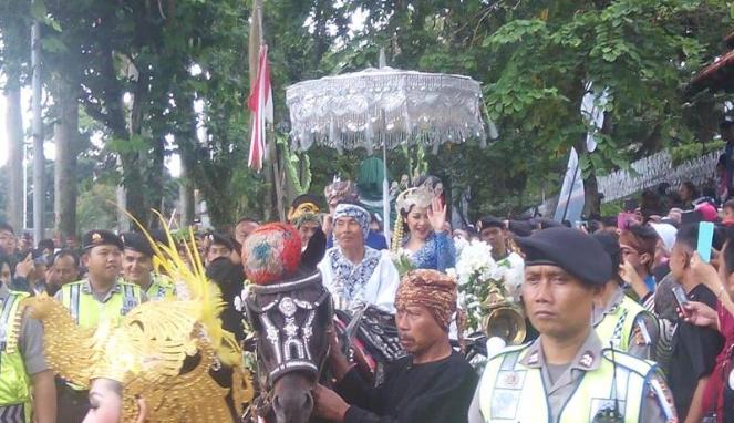 Prosesi adat dimulai dengan arak-arakan dari ujung jalan menggunakan delman. Raffi dan Gigi kompak menggunakan pakaian adat sunda berwarna biru.